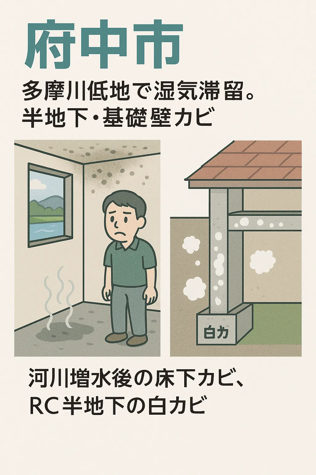 今回は、東京都府中市の多摩川低地エリアにお住まいの皆さまに向けて、近年ご相談が増えている「半地下・床下の白カビ問題」について取り上げます。