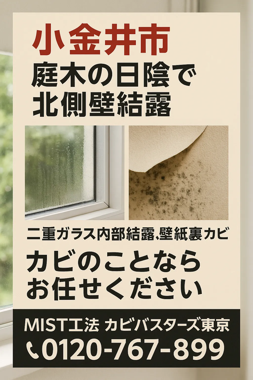 庭木の影が招く北側壁結露と二重ガラス内部結露がもたらす壁紙裏カビの恐怖【小金井市】