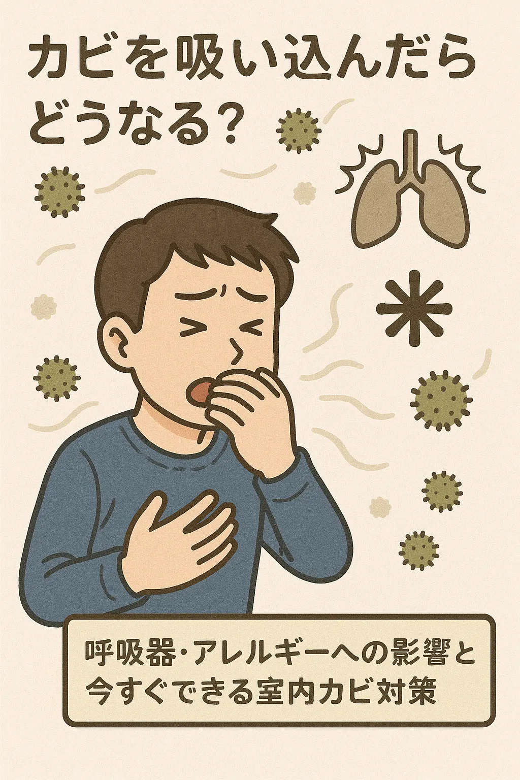 目に見えるカビやカビ臭がある場所では、空気中に大量の胞子が漂っています。これを吸い込むと、アレルギー症状や呼吸器疾患を引き起こす恐れがあります。特に免疫力の低い子どもや高齢者は影響を受けやすいです。