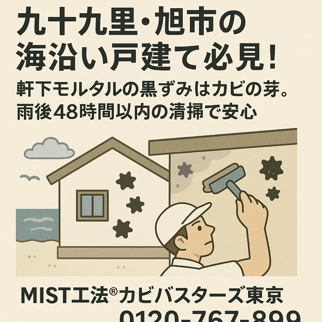 九十九里・旭市の海沿い戸建て必見!軒下モルタルの黒ずみはカビの芽。雨後48時間以内の清掃で安心