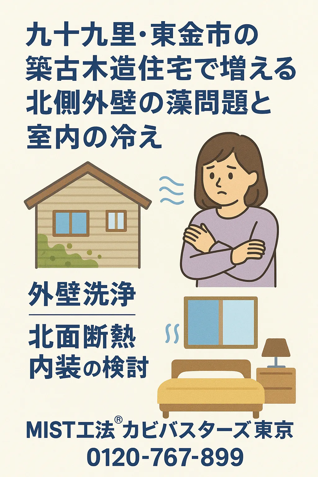 海霧や潮風の影響を受けやすい東金市エリアでの築古木造住宅。北側外壁の藻による劣化と、室内冷え対策のポイントを解説します。