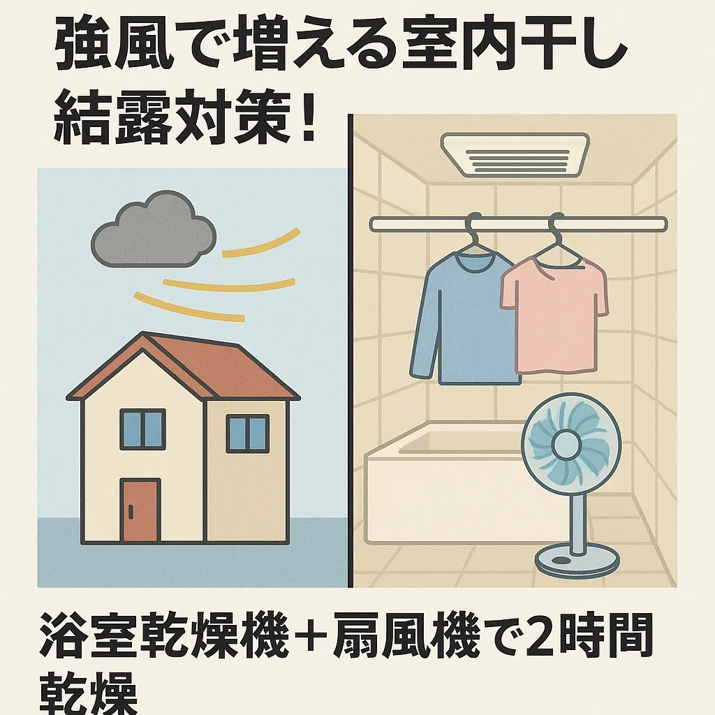 外房~房総南部|館山市の強風で増える室内干し結露対策!浴室乾燥機+扇風機で2時間乾燥