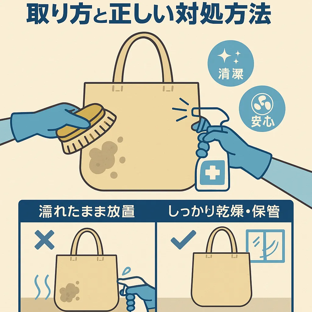 次の章では、実際にカビが生えてしまった時の「取り方」と「やってはいけない方法」について詳しく解説していきます。👜✨