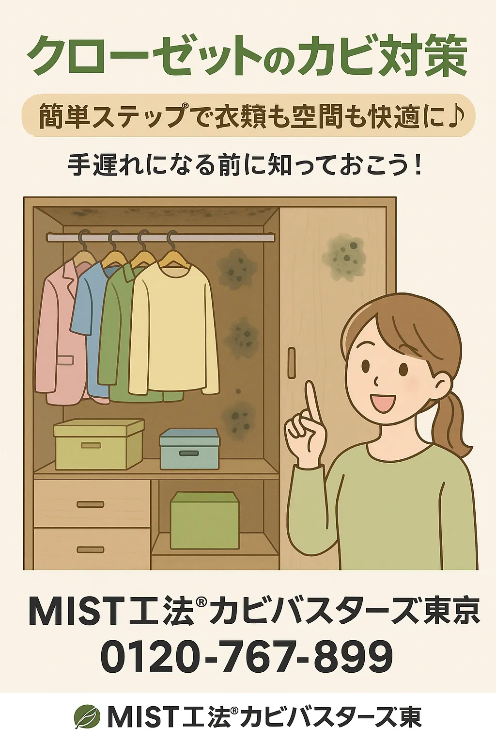 当社、 MIST工法®カビバスターズ では、環境に配慮した溶剤を用い、全国対応でカビトラブルを解決しております。クローゼットだけでなく「衣類収納庫」「押し入れ」「ウォークインクローゼット」など、様々なスペースのカビ・カビ臭も承っておりますので、「これ、ちょっと…」と思ったらお気軽にご相談くださいね。