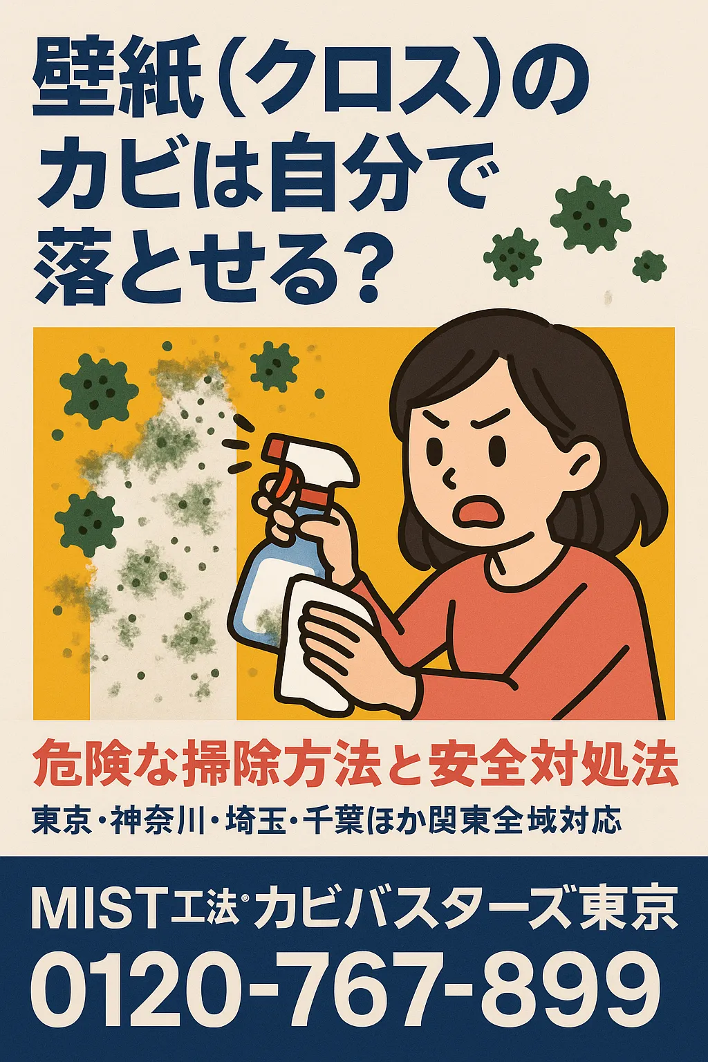 壁紙(クロス)に黒い点々や白いモヤのようなカビを見つけたとき、「自分で掃除して大丈夫かな?」と不安になる方が非常に多くいらっしゃいます。特に東京や神奈川、埼玉、千葉、茨城、群馬、栃木といった関東地方では、気密性の高い住宅やマンションが増え、湿度がこもりやすい環境が整ってしまうことで壁紙にカビが年々増えています。私たちMIST工法®カビバスターズ東京にも、壁紙のカビに関するご相談が後を絶ちません。