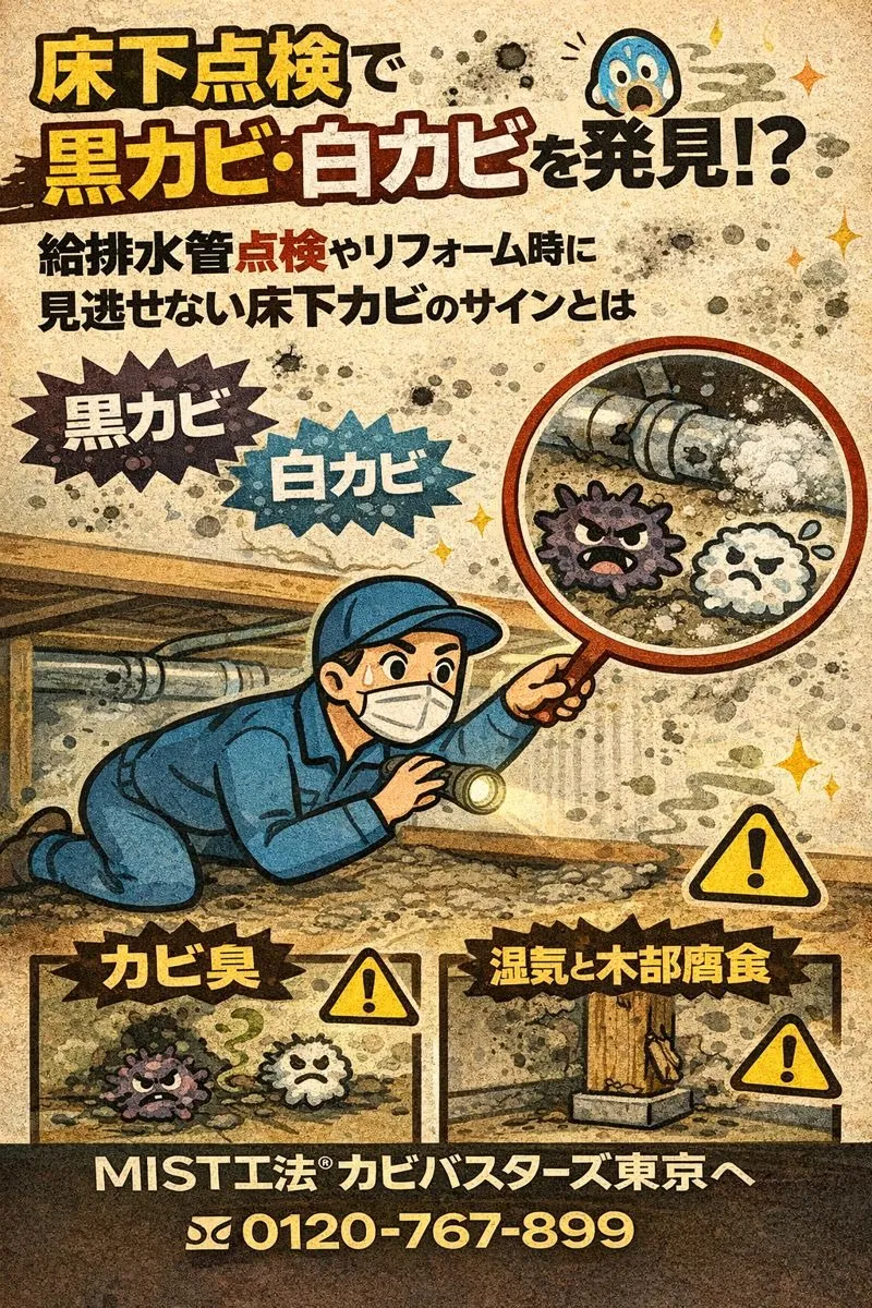 床下点検で黒カビ・白カビを発見!?給排水管点検やリフォーム時に見逃せない床下カビのサインとは