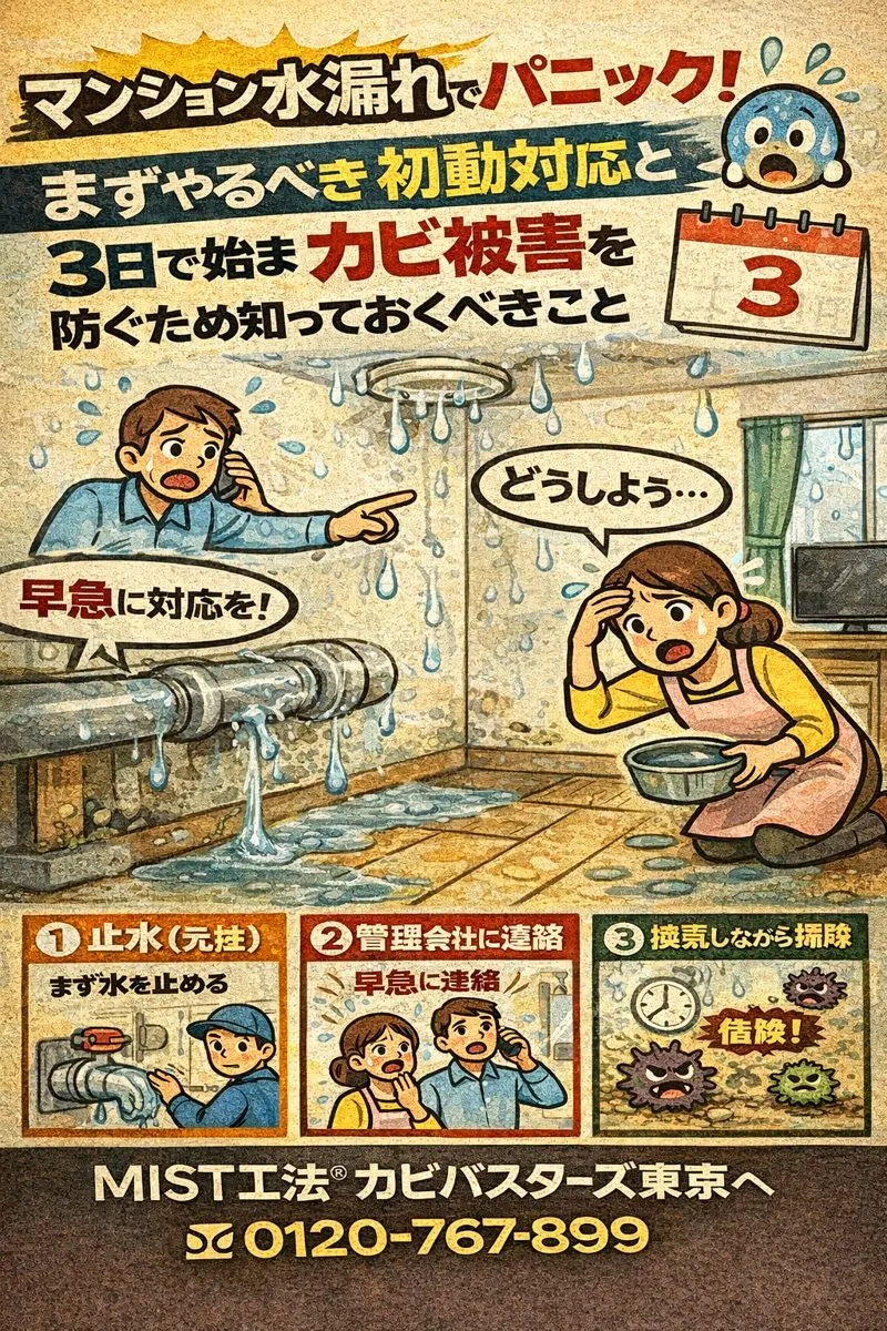 【マンション水漏れでパニック!】まずやるべき初動対応と、3日で始まるカビ被害を防ぐために知っておくべきこと