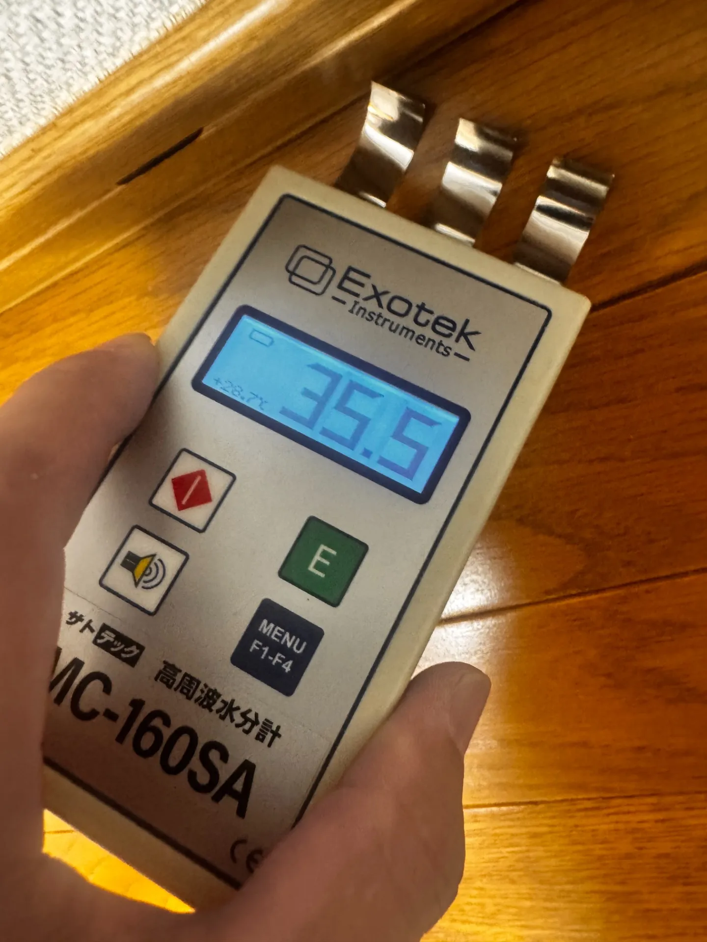 MIST工法🄬カビバスターズ東京では、現地調査の際に含水率検査を行い、園舎の壁や床がどの程度水分を含んでいるかを確認します。見た目には乾いているように見えても、内部に湿気が残っているケースは決して少なくありません。
