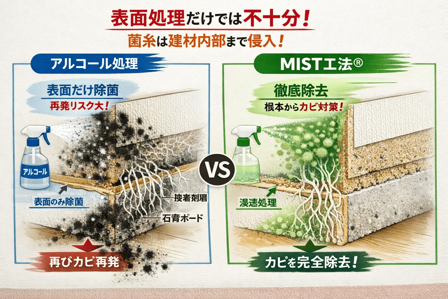 カビバスターズ東京が採用している「MIST工法」は、素材を削ったり擦ったりすることなく、独自開発の専用液剤を用いて施工いたします。壁紙を剥がさずに対応できるケースも多く、コストと工期を大幅に短縮しながら、建物へのダメージを最小限に抑えます。