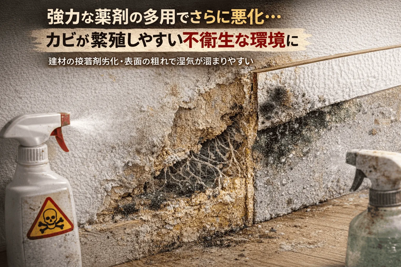 法人にとってこの問題が厄介なのは、単に「見た目が悪い」というレベルに留まらない点にあります。カビは建材の石膏ボードや木材の繊維を分解し、構造的な腐食を引き起こすだけでなく、浮遊するカビ胞子によって従業員の健康被害(シックハウス症候群や喘息、アレルギー)を誘発し、企業の安全配慮義務を問われるリスクへと発展します。また、4月の入居・退去シーズンにおいて、管理物件の壁紙にカビが浸透していると、高額な原状回復費用が発生し、資産価値を著しく損なうことになります。