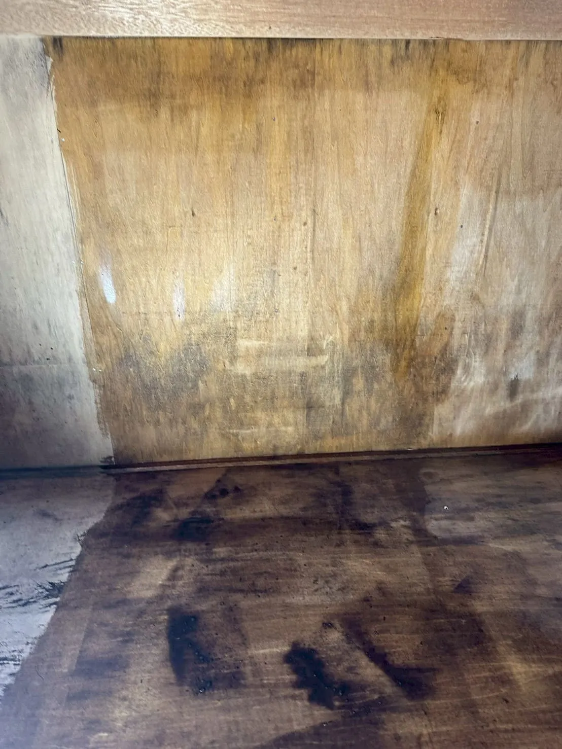 押し入れは三方が壁に囲まれており、地下室の中でも最も空気の入れ替えが困難な場所です。資料がぎっしりと詰め込まれていた押し入れの奥を確認すると、ベニヤ板が湿気で波打ち、一面がカビで覆われていました。ここでは、素材を傷めない性質を持つ独自の液剤を使用しました。カビを根絶しようとして強い酸やアルカリ、あるいは素材を白く変色させるような薬品を使うのは、建物の資産価値を下げる行為です。私たちは、素材の耐久性を維持しながら、カビの細胞壁を破壊し、再増殖の能力を完全に奪う手法を徹底しました。