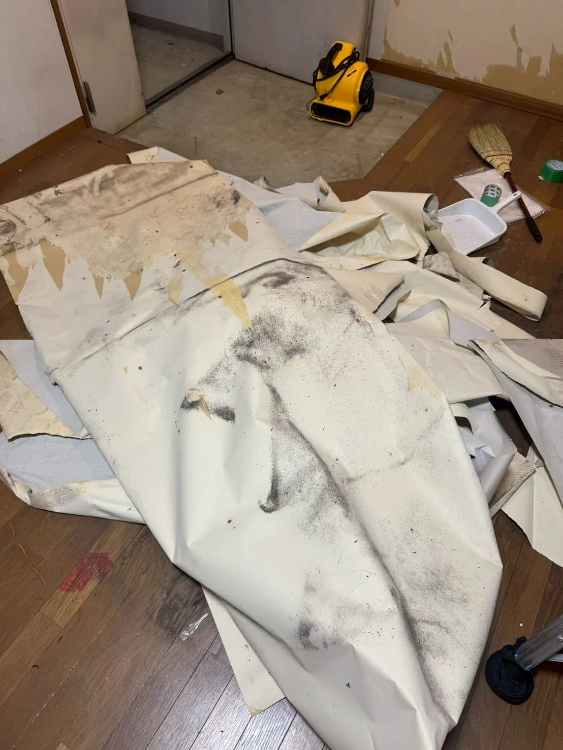 壁紙の表面に黒い点や変色が見られる場合、それは「氷山の一角」に過ぎません。カビは壁紙とその裏側にある石膏ボードやコンクリートの「間」で爆発的に増殖します。今回の台東区東上野の現場でも、一見すると少し汚れている程度に見えた壁面を、私たちは迷わず全て剥離しました。すると、壁紙の裏側にはびっしりと黒カビのコロニー(集落)が形成されていました。この状態で壁紙の上から何かを塗ったり、表面を拭いたりしても意味がありません。下地に対して直接、専用の除カビ液剤を浸透させ、カビのタンパク質を根元から分解することで、初めて再発しない壁面へと戻すことができるのです。