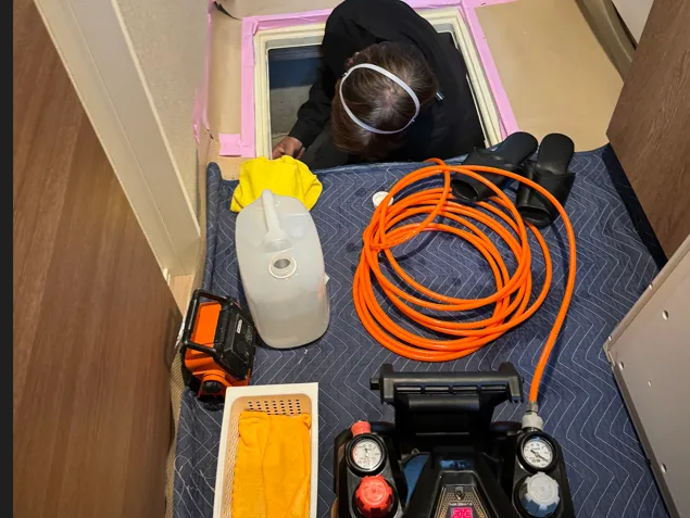 最終日の3日目は、午前中にライトを当ててくまなくチェックし、わずかな洗い残しも許さない補修処理を実施。午後からは仕上げの「除菌処理」です。通気パッキン工法特有の課題である「薬剤の流出」を防ぐため、建物の外周を養生ですべて塞ぎ、床下を一時的に密閉状態にしました。この状態で高濃度の除菌ミストを充填し、空間全体を浄化。最後に、施工前後の変化を数値と写真で記録した詳細な報告書を作成し、ハウスメーカー様と施主様へ提出。明確なビフォーアフターにより、両者から深い納得と安心の声をいただきました。