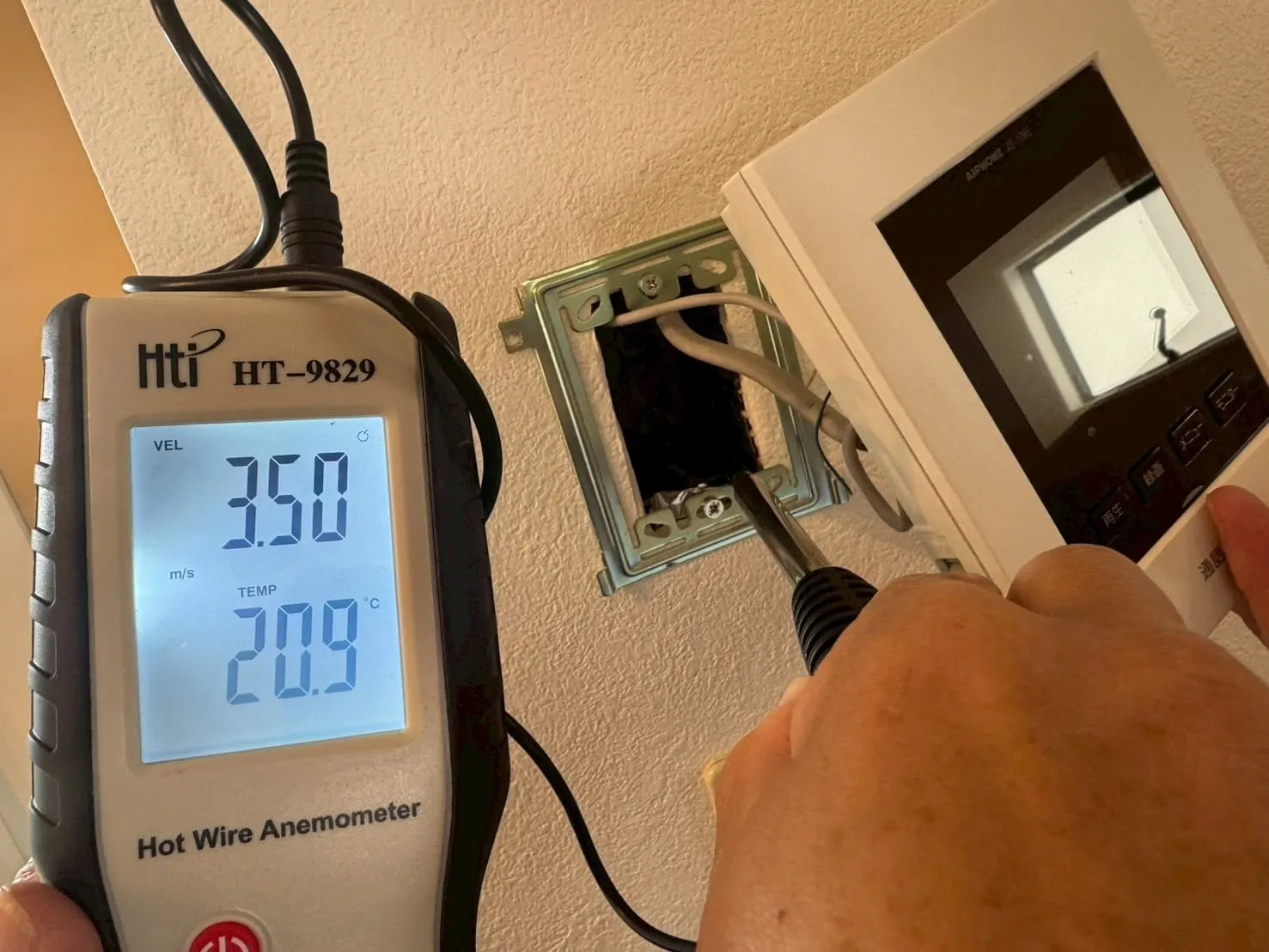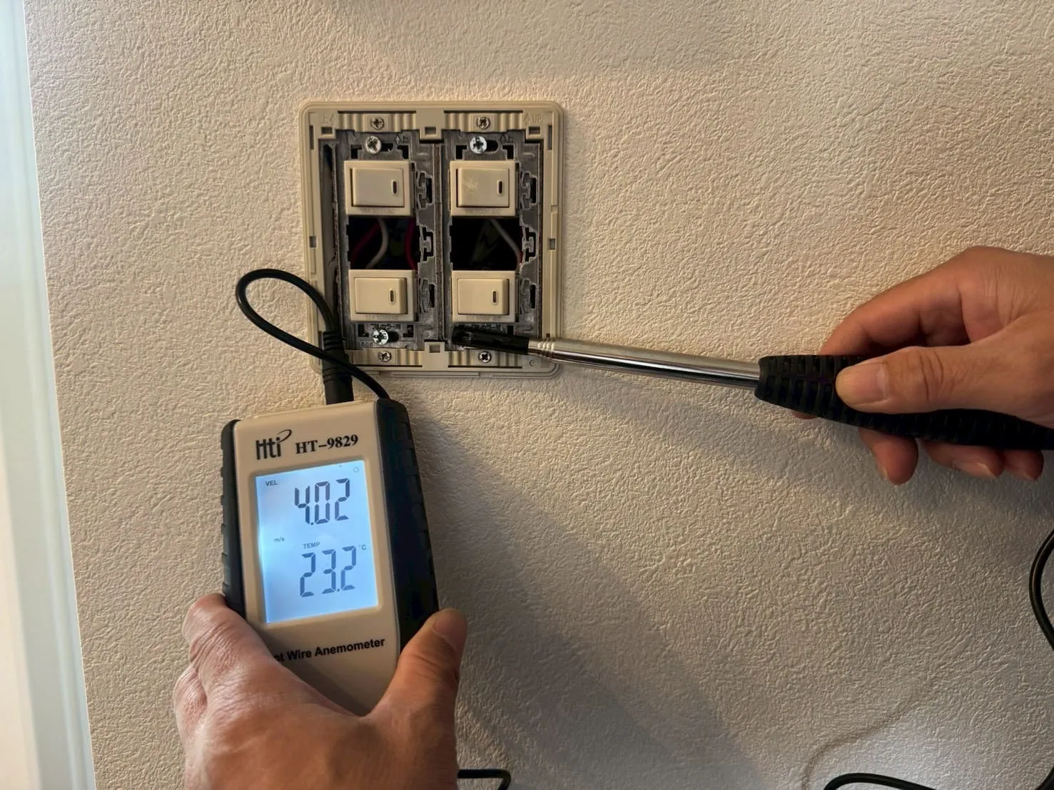 コンセント・配電盤・インターフォン・給湯器スイッチなど、合計26箇所を測定した結果、すべての箇所から室内へ空気が引き込まれている状態でした。さらに驚くべきことに、強い箇所では風速4m/s以上という非常に大きな気流が発生していました。これは単なる隙間風ではなく、明らかに異常なレベルの負圧状態です。この状態では、壁内・天井裏・床下の空気を積極的に吸い込んでいる状態となり、室内環境に大きな影響を与えます。