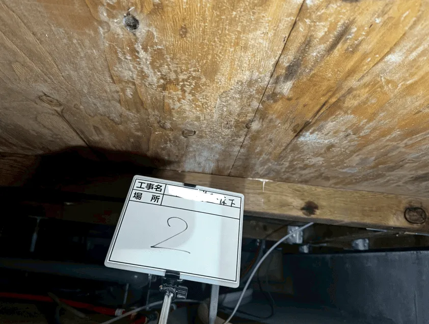 含水率検査では、床合板・木部・基礎コンクリート・立ち上りコンクリートなど、床下の各部位を複数箇所にわたって計測します。1箇所だけを測定するのではなく、床下全体をくまなく計測することで、湿気が特に集中している箇所や、カビの発生リスクが高いエリアを面として把握することができます。今回の目黒区の現場でも、100㎡超の床下全体を丁寧に計測したことで、最高38.6%という深刻な数値を見逃さずに記録することができました。