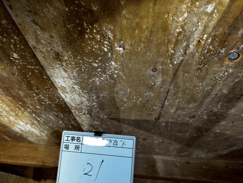 さらに問題なのは、床を設置した後に床下が点検されないケースが非常に多いという現実です。外壁・内装・設備など、目に見える部分の検査や確認は工程ごとに行われる一方で、床下は一度床材を張ってしまうと目視できなくなるため、引き渡しまでの間に誰も確認しないまま工事が進んでしまうことがあります。カビは暗く湿った環境で急速に繁殖しますが、その様子は床の上からは一切わかりません。引き渡し時に施主様が床下の状態を知らないまま入居するケースも少なくなく、カビ臭いと気づいた時にはすでに広範囲に広がっていたという事例も実際に起きています。