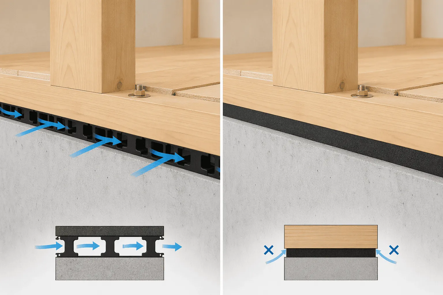 基礎断熱工法には、大きく分けて「基礎内断熱」と「基礎外断熱」があり、いずれも床下空間を外気から遮断する構造です。気密パッキンを使用することで高い断熱性能を実現できる一方、床下の換気経路が従来工法と根本的に異なります。この換気の仕組みを理解せずにカビ対応を行っても、施工後に再発するリスクが高く、根本解決にはなりません。
